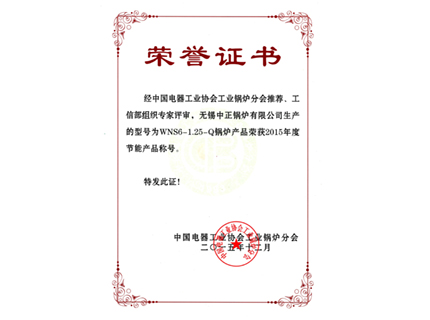 2015年11月, WNS6-1.25-Q型燃氣冷凝蒸汽鍋爐榮獲工信部評選的"節能產品"